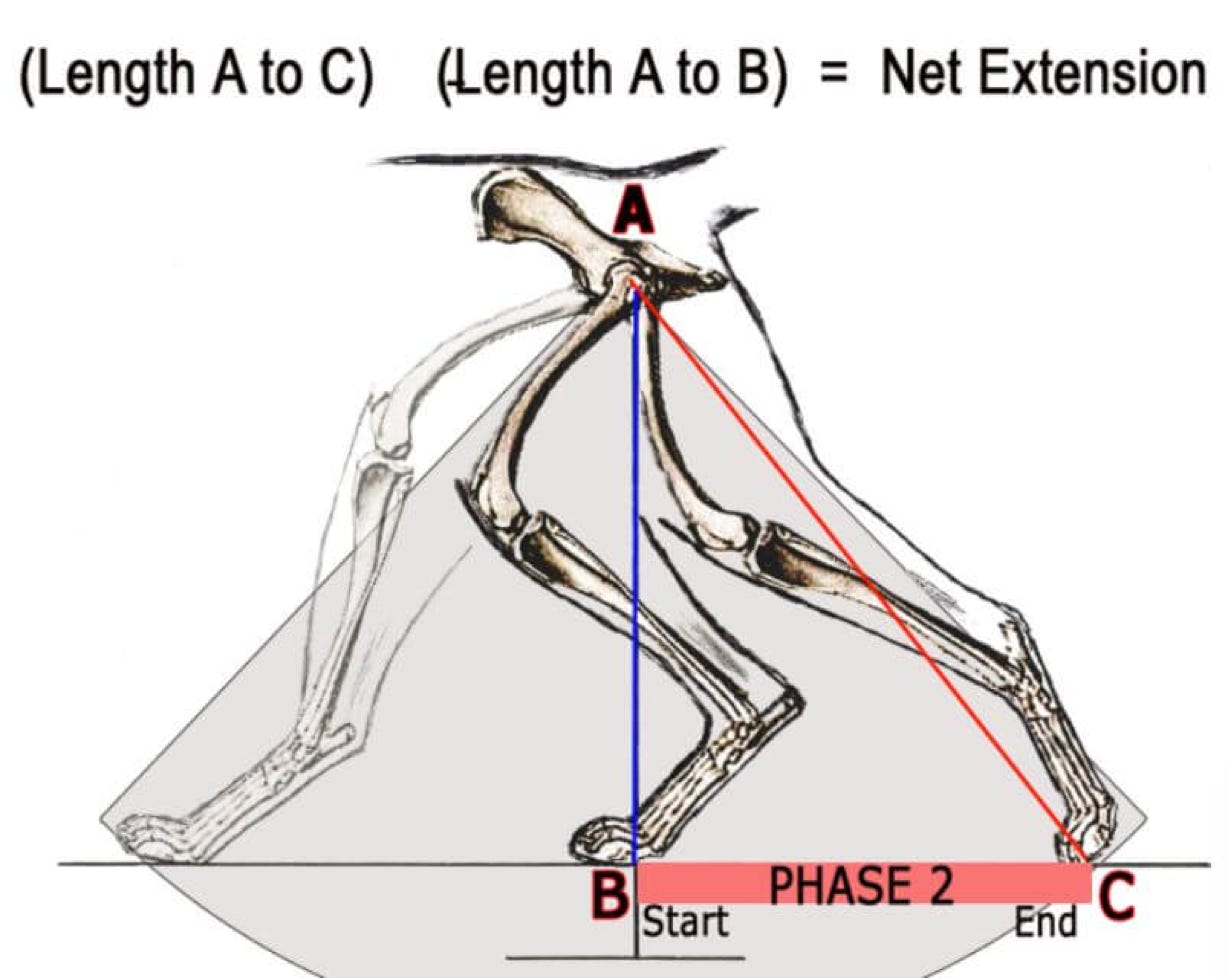 ‍Another area of importance is the net extension applied during the back reach in phase two. The net extension is the measured difference between the distance from the hip joint to the paw at the beginning of phase two when the rear angles are closed, and the distance from the hip joint to the paw at the end of phase two when the rear angles are open. Net extension is a key component in determining the amount of rear drive a dog can generate.
