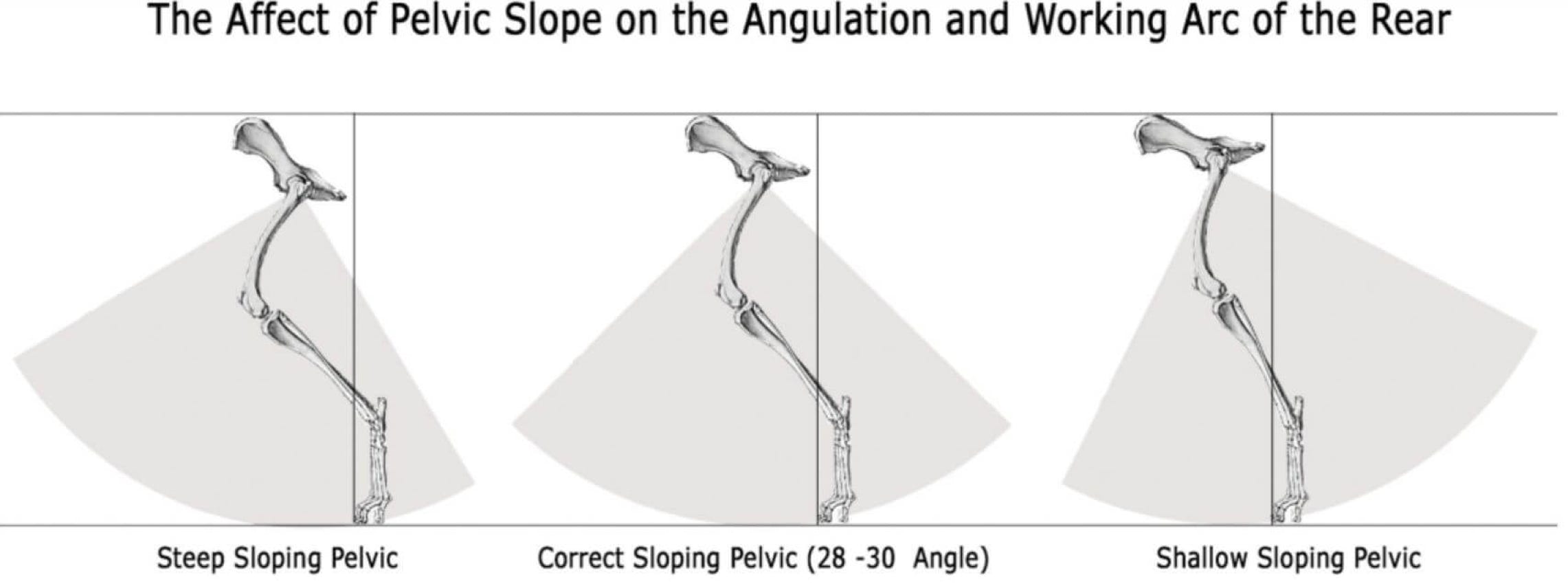 ‍The angled slope of the pelvis helps determine the angulation you see when the dog is standing. Dogs with the same proportions and length to their bones of the rear assembly can visually display different angulation depending on the slope of their pelvis. Notice the changes in the amount of angulation associated with different pelvic slopes in the figure below. A dog with a steeply angled pelvis will display more turn in the stifle and hock than dogs having a more moderate or lesser angled pelvis. Again, this is dependent upon all bone proportions being the same.