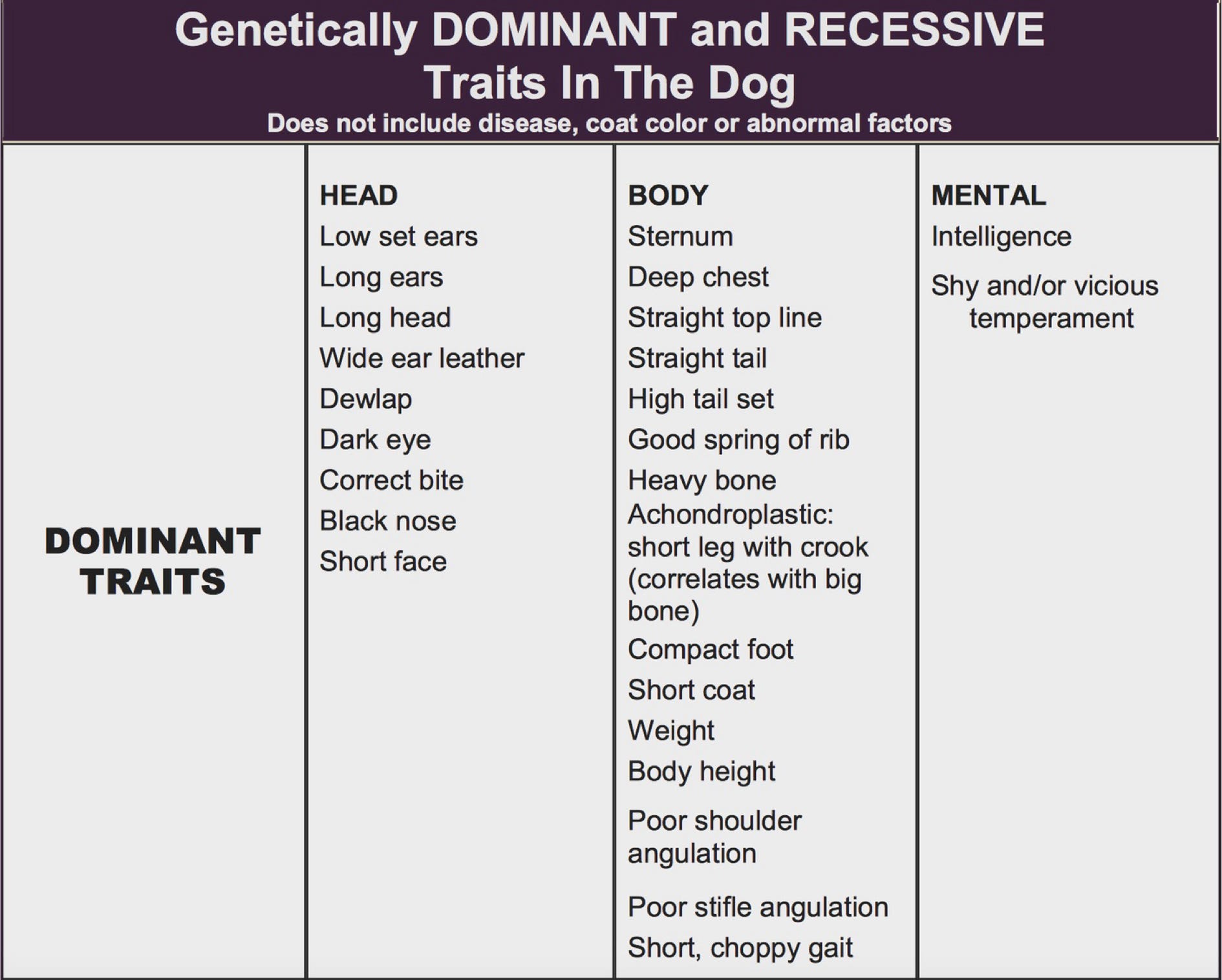 Although research in canine genetics lags behind that of other species, and some authorities disagree on whether certain traits are indeed dominant or recessive, Figure 2 lists those dominant and recessive traits agreed upon by a majority of geneticists and breeders (Willis, 1989; Seranne, 1980).