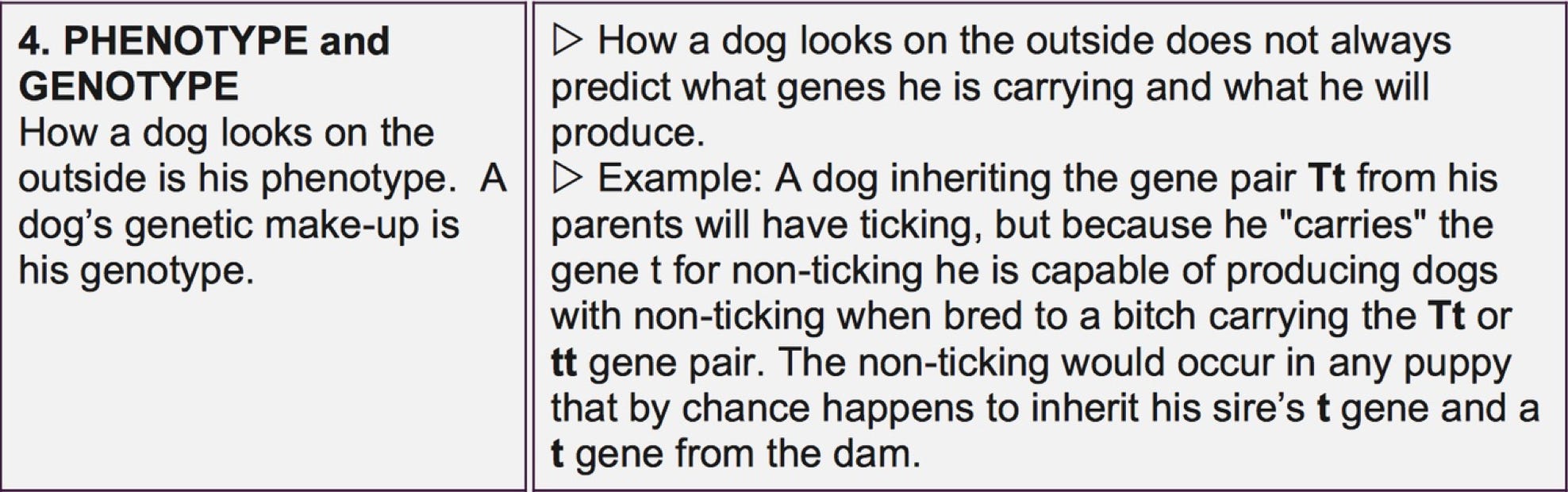 The term genotype refers to the genetic make-up of an animal. It refers to the letter symbols describing the gene pair. The term phenotype is used to describe the external appearance resulting from a gene’s action. Thus the genotype for dogs with ticking is either TT or Tt, while the genotype for non-ticking is always tt. Every breeder needs to understand that a dog is really two different entities: what we see on the outside (the phenotype) does not always predict what genes he is carrying on the inside (genotype). If a dog happens to carry the Tt gene pair he himself will have ticking. When bred to a female carrying either TT or Tt, however, he is capable of producing puppies with non-ticking (see Figure 1).