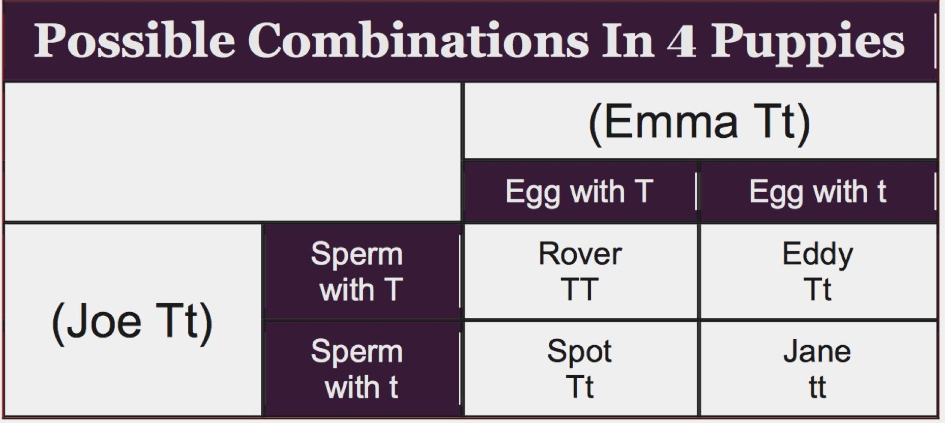 Geneticists and breeders frequently use a diagram called a Punnett square to predict the expected outcome of individual breedings. Genes or traits that can be contributed by one parent are listed on the top of the diagram; at the left are listed genes that may be contributed by the other parent. Possible combinations that can be produced in the offspring are found in the squares formed by the intersection of the columns and rows. Figure 1 shows the mating of Emma to Joe and the expected outcome relative to ticking and non-ticking. Joe and Emma both carry the Tt gene pair; they can each contribute a T or a t to each puppy.