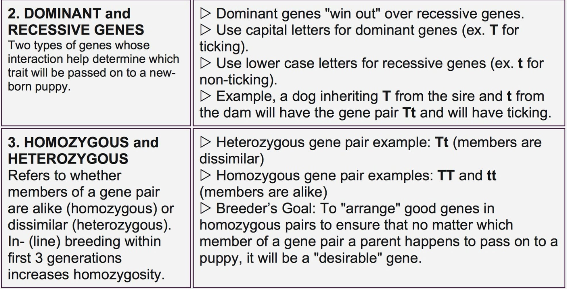 One of the major conclusions that emerged from Mendel’s work that affects our breeding of dogs is that genes are inherited in related pairs, one from each parent. Mendel discovered some genes over-rule the activity of others. These are called DOMINANT genes and geneticists depict them with an upper case letter. For example, we know that the gene T for ticking (color spots in white patches) is dominant and over-rules the gene t for non-ticking. Genes that are over-ruled are called RECESSIVE genes and are represented by lower case letters. The alternative forms of a particular gene, in this case, T for ticking and t for non-ticking, are known as alleles.