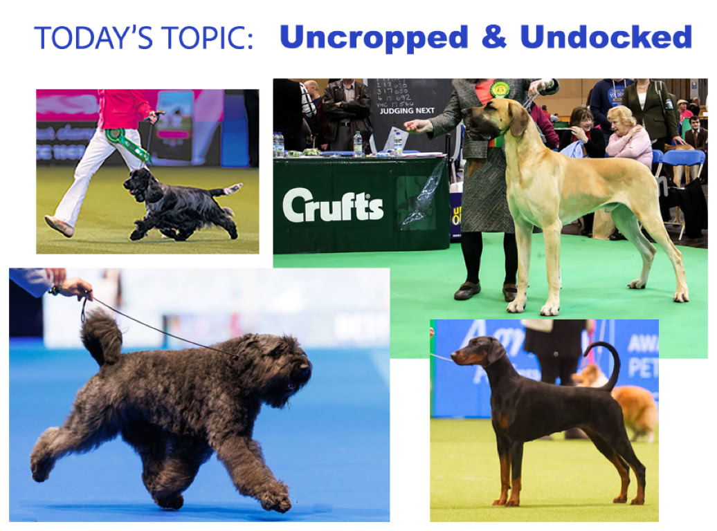 "As we see more and more kennel clubs throughout Europe and the world making any dog that is cropped or docked ineligible to be shown, there seems to be an increasing number of dogs appearing in American show rings with uncropped ears and natural tails, yet many breed standards have not yet addressed this issue. I know that some parent clubs are vehemently against changing their standards to accommodate this. This must be a cause for confusion among judges. What are your thoughts on this issue?"