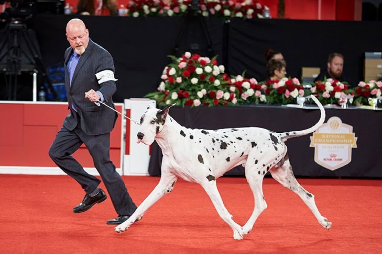 In addition to circling around the ring at a trot, every dog at a dog show is asked to move away from the judge and then back again in a straight line. This “up and back” affords the judge a different view of the dog’s anatomy and how it works on the move. As the dog gaits away, the judge can gauge the strength of the rear assembly, and on the return trip, she can assess factors like elbow placement and whether there are any deviations from normal front movement, like toeing out (where the forefeet point outward) or paddling (in which the pasterns and feet flip forward to artificially lengthen the stride at the trot).