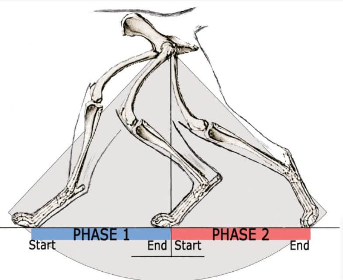 ‍As the angles open, the toes of the rear foot first start to come into play by digging into the surface, providing traction as the rear leg fully extends its angles backwards. This sequence of rear action repeatedly goes from right rear leg to left rear leg over and over. As the right leg goes through phase one and two, the left leg lifts from rear extension after phase two and begins closing its angles in the process of moving the leg forward and re-extending just before the start of phase one. Then, they switch.