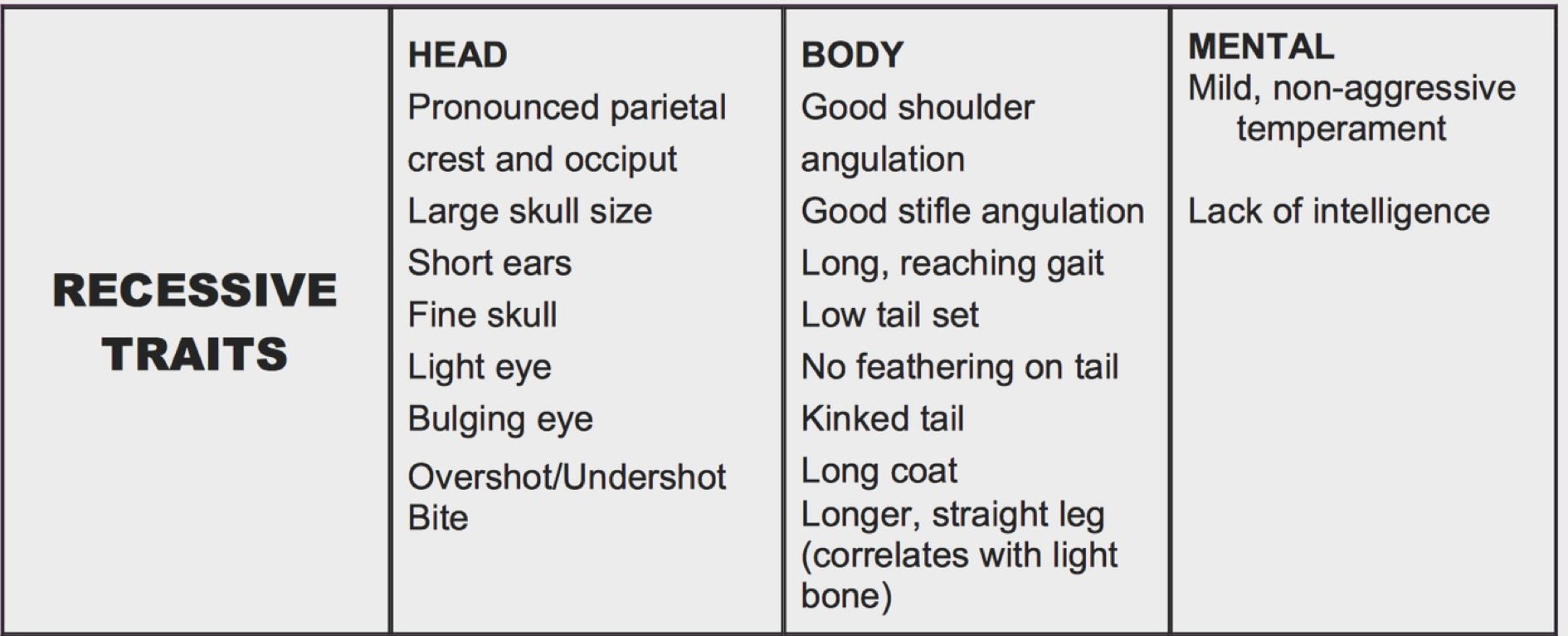 Although research in canine genetics lags behind that of other species, and some authorities disagree on whether certain traits are indeed dominant or recessive, Figure 2 lists those dominant and recessive traits agreed upon by a majority of geneticists and breeders (Willis, 1989; Seranne, 1980).